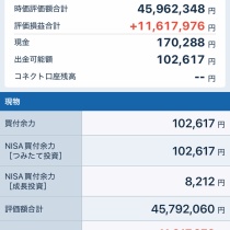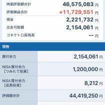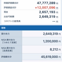 資産状況・資産(2024年末) :33,967,639円・現在資産(251107):45,962,348円・税引き前利益:+11,994,709円(+35.31%)(税引き後配当金+840,886円を含む、入金除く、去年末比)資産内訳・信用評価損益:+0円・個別株(現物):45,792,060円・現金:170,288円・信用買建玉( ...