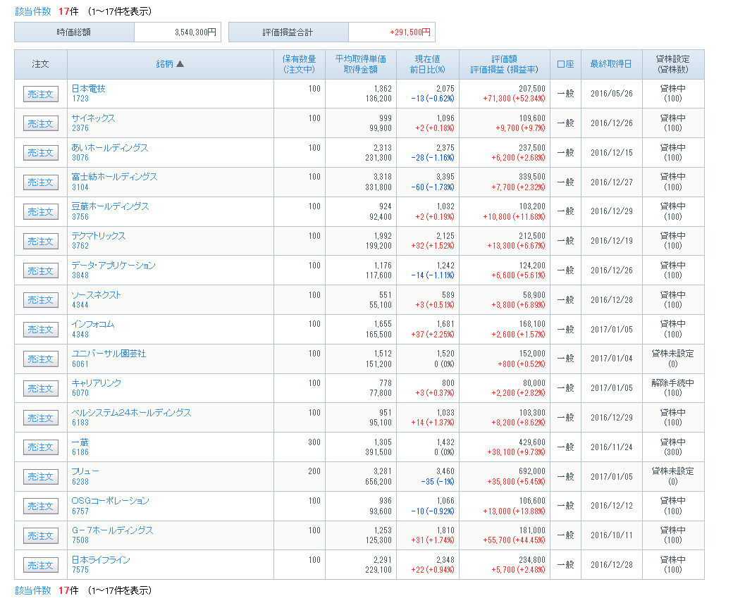トレード記録(170102~170108) 2017年01月07日 12:33 損益(170102~170108):132978日経平均PER:16.55、EPS:1175.49(170107) キャッシュ比率を増やすため、100/300株フリューを売却し、100/200株ユニバーサル園芸社を売却し、キャリアリンクを100/200株売却し、100/100株アイ・アールジャパンホールディングスを売却した。 「トレード記録」カテゴリの最新記事 < 前の記事次の記事 > コメント コメントフォーム 名前 コメント 評価する リセット リセット 顔 星 投稿する 情報を記憶