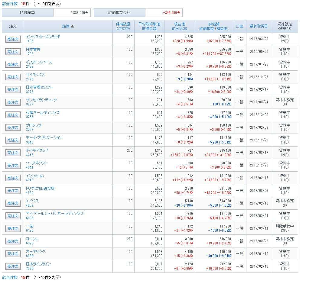 ユニバーサル園芸社100株、一蔵200株、明星工業300株、日本社宅サービス100株、キャリアリンク100株を売却し、サンセイランディック100株を購入し、為替の影響を受けるが、成長力の高さで、円高にも耐えられそうなローツェ200株を購入した。