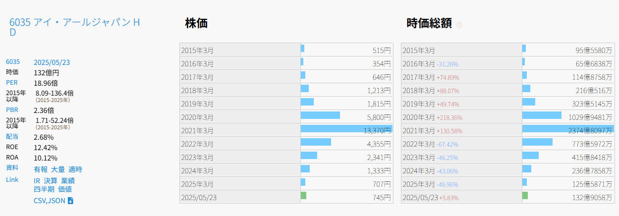 2017年の1月から5月まで保有していたアイアールジャパンが、2025年に、インサイダー取引関与の疑いでニュースになっていた。2017年に、成長を強く期待して保有していたのに、他の保有株と比較してPERが高く、割安という点では微妙に思えて、自分は購入した2017年に売ってしまった。自分が売却した後に、アイアールジャパンは、2021年まで、驚いたことに利益が4倍に拡大し、信じられないことにPERも5倍以上(PER16.62→PER84.72)になり、4年間で、株価は約20倍になった。そんなバカな。